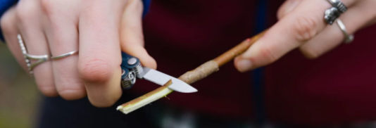 - 薪割り:SURGE のノコギリで木をカットし、ナイフでフェザースティックを作る。