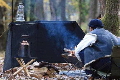 陣幕は、焚き火だけでなく「人」も風から守ります。 特に気温が低い季節では、風速 1 メートルで体感温度が 1 度下がると言われています。 陣幕が冷たい風を遮るだけで、体感的な快適さは大きく変わります。