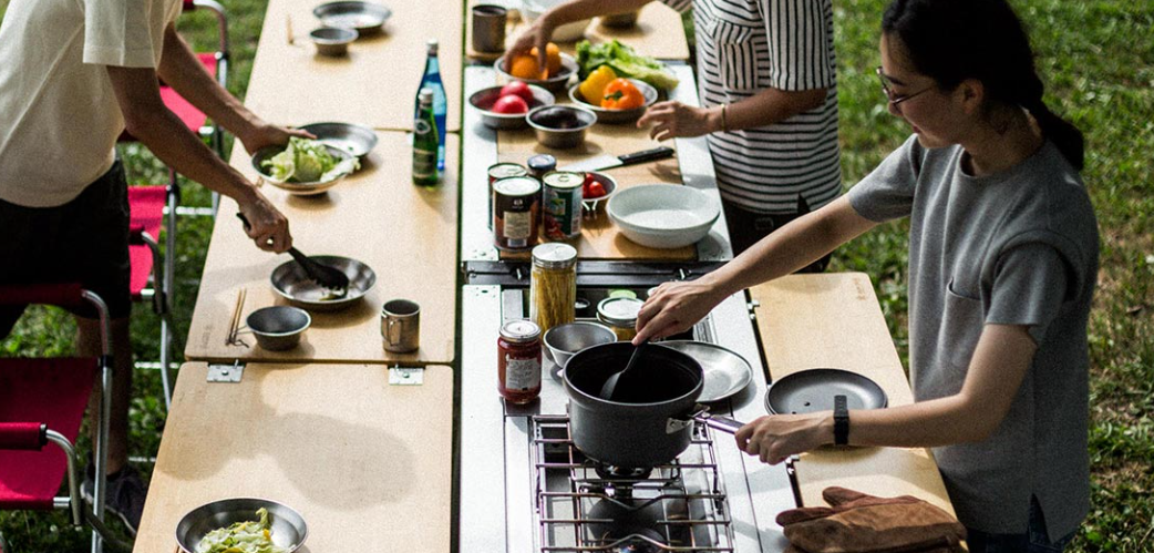 IGT規格が誕生する以前、キャンプのキッチンやリビングは、コンロ台、調理台、食事用テーブルなどがそれぞれ独立していました。