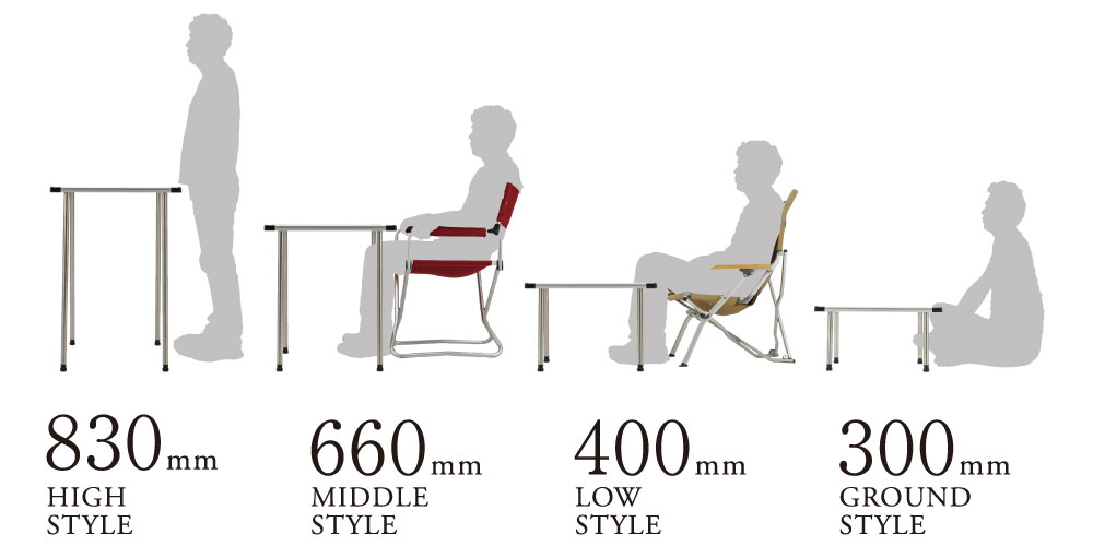 使用するチェアに合わせて脚の高さを選ぶのが基本ですが、調理時はハイスタイル、食事はロースタイルといったように、シーンによって脚を使い分ける上級キャンパーもいます。