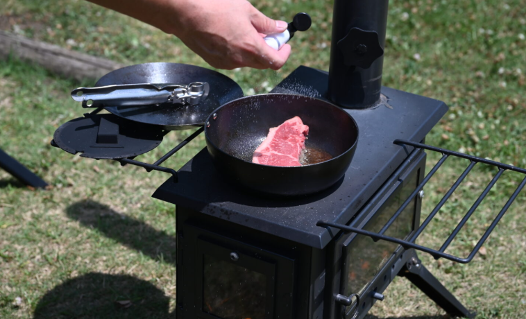天板を利用すれば、ケトルで湯を沸かしたり、スキレットで肉を焼くことも可能です。