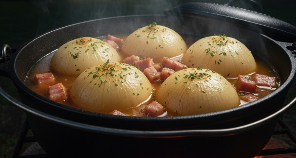 | 手順1 | ダッチオーブンに玉ねぎを並べ、隙間にベーコンを入れる。 |