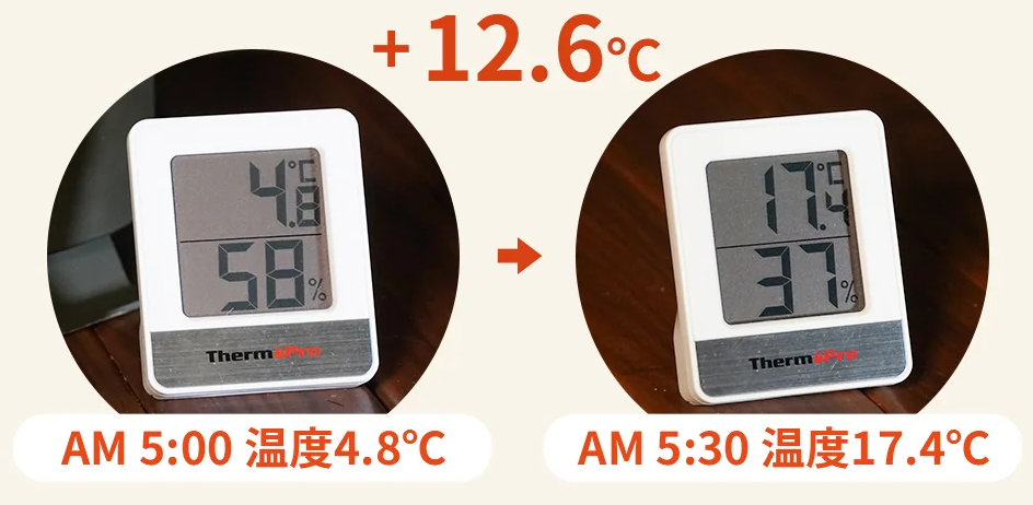 30分後17.4℃+12.6℃自宅のリビングのような快適さ