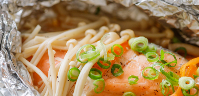 - アルミホイルの縁をしっかり閉じ、中身が出ないように包みます。