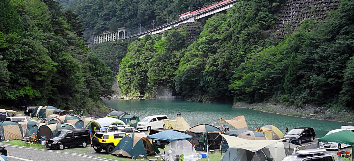 アプトいちしろキャンプ場は、長島ダムによって形成された「接岨湖(せっそこ)」のほとりに位置しています。