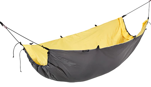 アンダーキルト (推奨)体重で潰れないため、ダウンや中綿のロフト(かさ高)が維持されます。 ハンモック全体を暖めるため、保温効率が非常に高いです。 寝返りを打ってもズレません。専用品のため、追加のコストがかかります。 正しく装着しないと隙間風が入り、効果が半減します。
