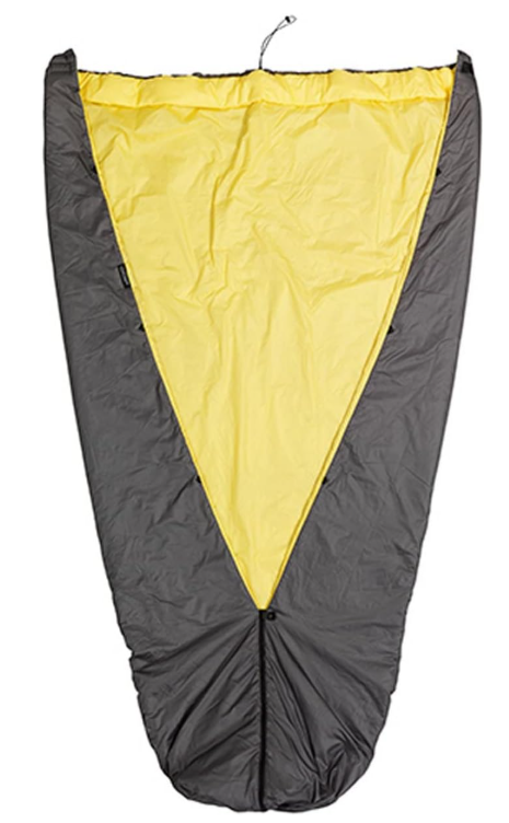 これは寝袋から背中側の生地と中綿を省略したような形状で、軽量化・コンパクト化に貢献します。