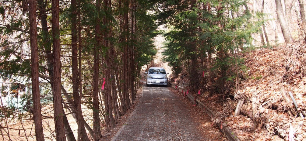 駐車場までの道は、すれ違いが困難な細い山道が続きます。