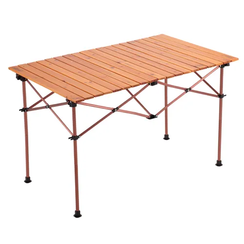 キャンプサイトの雰囲気を格上げしてくれるのが、木製天板の「ナチュラルウッドロールテーブル」です。