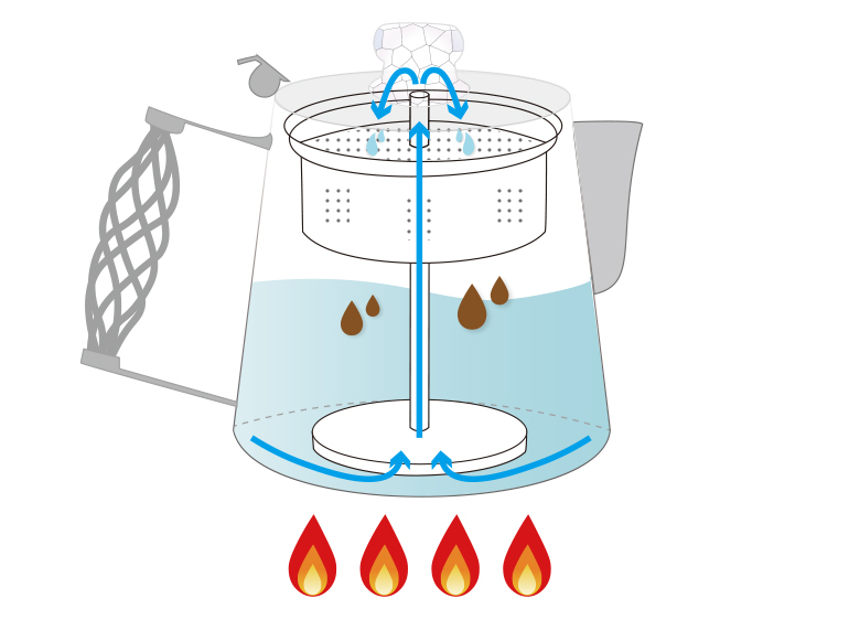| 4. 沸騰・循環 | – お湯が沸騰すると、お湯がパイプを通り、蓋の透明ノブから見えるようになります | – 沸騰したら、すぐに弱火にします |