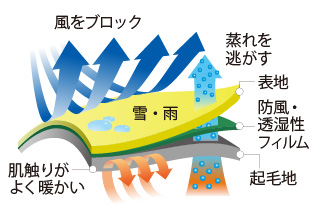 防風性と透湿性を持つ特殊なフィルムを、表地と裏地の間にしっかりと挟み込んだ構造になっています。