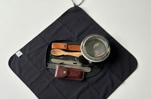 | キャンプ用クッカー | 1. 布の中央にクッカーをドンと置く 2. 巾着袋のように上部で全ての布をまとめる 3. まとめた布をねじり、ゴムで根元をきつく縛る | 熱々の状態ですぐに包むと表面のナイロンが溶ける可能性があるため、少し冷ましてから包む |